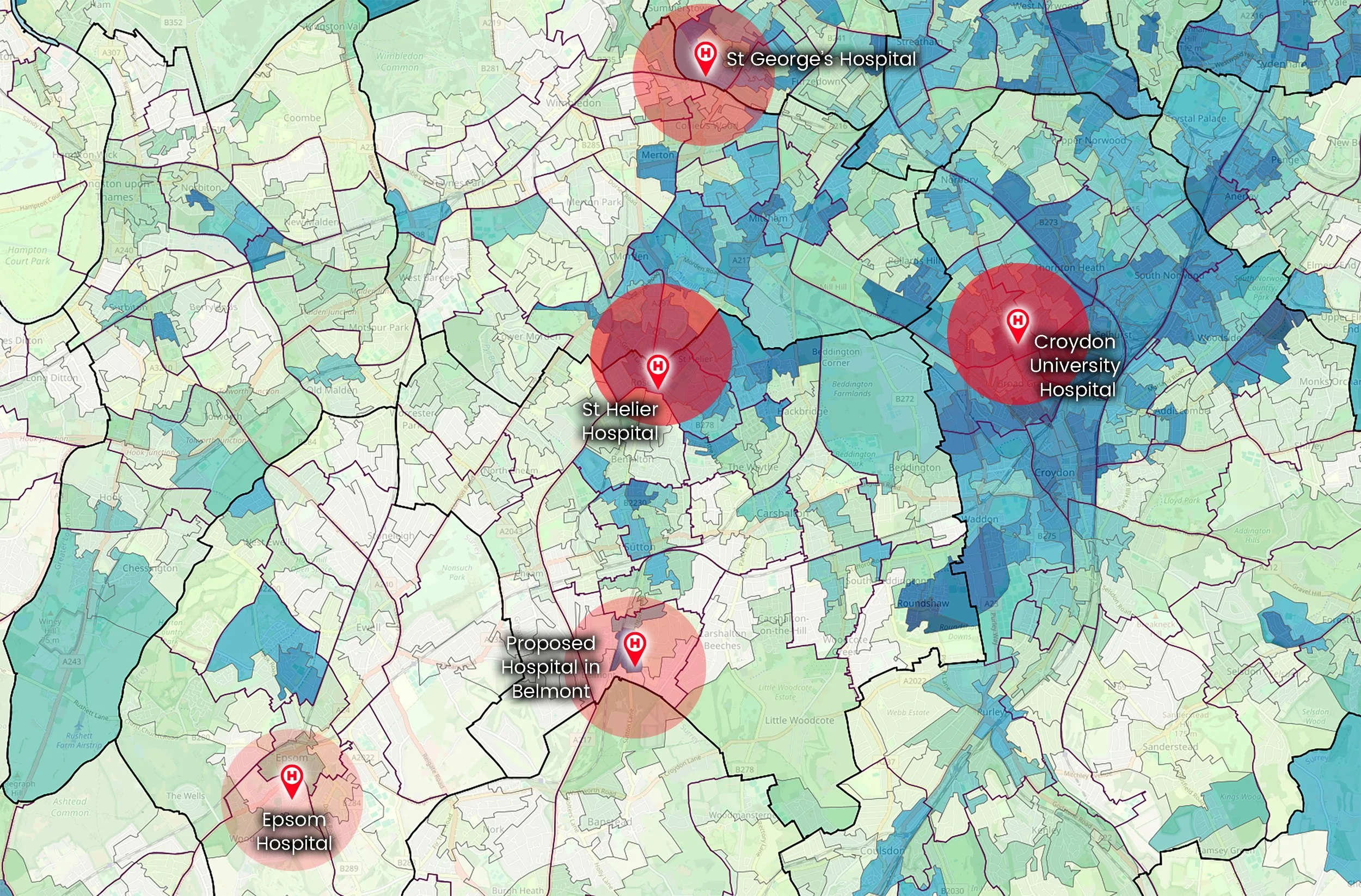 Map of Deprivation in areas around hospitals in South-West London without transport